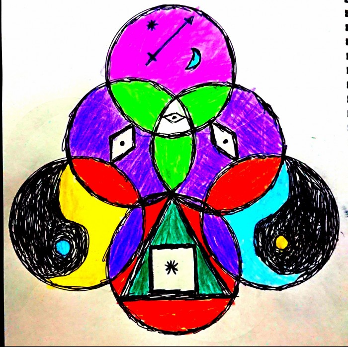 In sycolopix we have at da top a space for da zodiac a star and a moon filled with pink for energy below we have da trinity on its side with a third eye in its centre either side a dragons head going into polar yang with idealism and communication a teal triangle for universal magic and a square for Jupiter's philosophical ambition cased in a red and purple circle for Royal and psychic power with a 9 pointed star for rudamentalism at its very heart this symbol is of interchangeable realitys due to da spheres of colour and there symbolic capacity of captivating it is da logos of vision and supports creative visualisation balancing it and captivating outhers with it it's a butterfly of opportunity and when it flaps its wings it raises power as a it is da divine flowering of nature